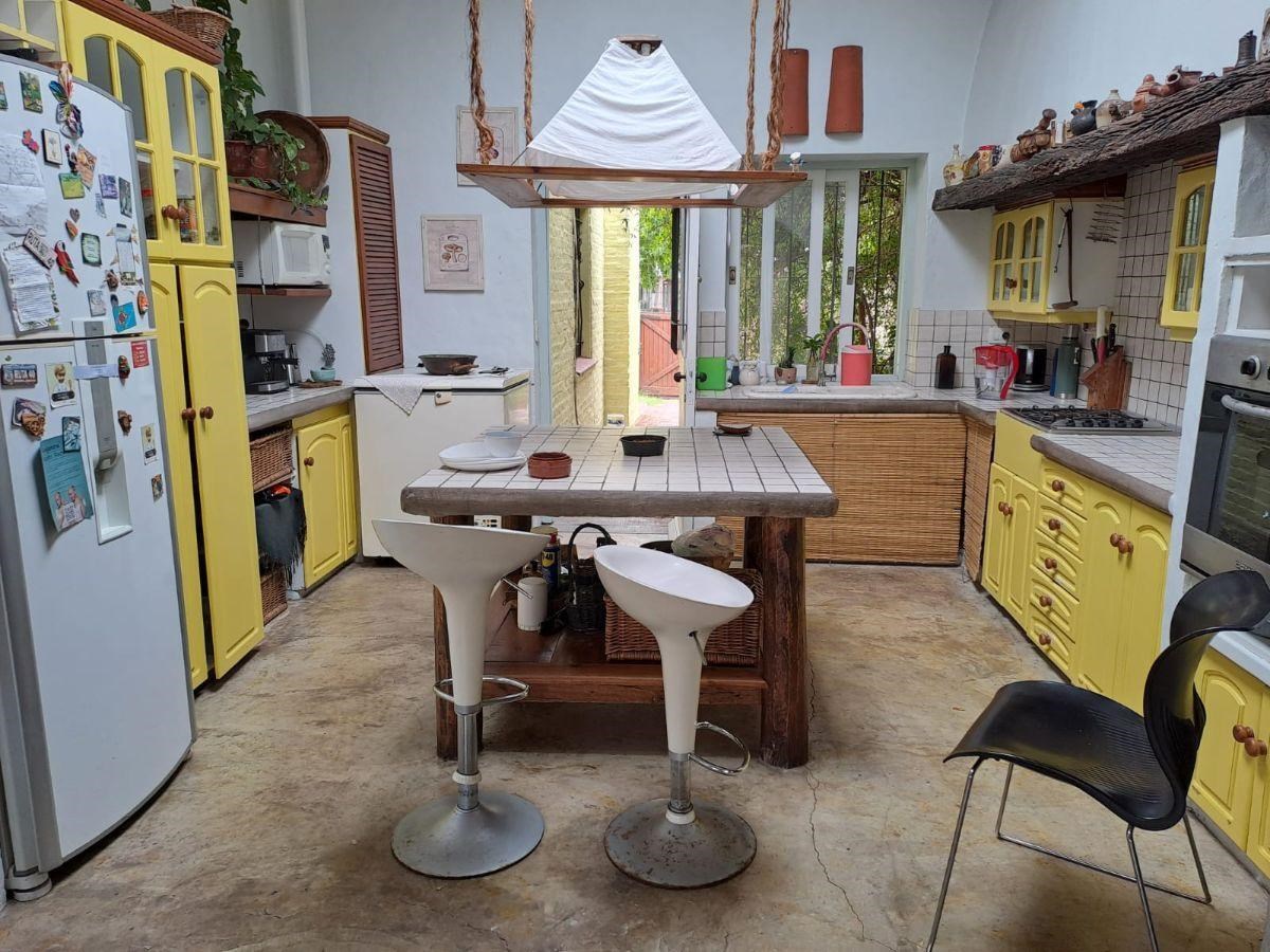 Cocina comedor diario con piso de cemento alisado con muebles bajo y sobre mesada en madera, en el centro una hermosa isla.